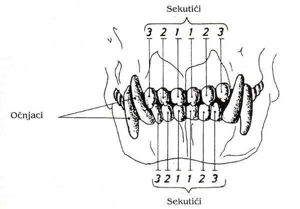 Čeljusti/zubalo/zubi: Veliki zubi. Snažna čeljust sa perfektnim i potpunim makazastim zagrižajem, pri čemu sekutići gornje vilice naležu svojom unutrašnjom površinom na spoljnu površinu sekutića donje vilice. Zubi su pravilno uređani u vilicu. Sa 42 zuba se obrazuje zubna formula.