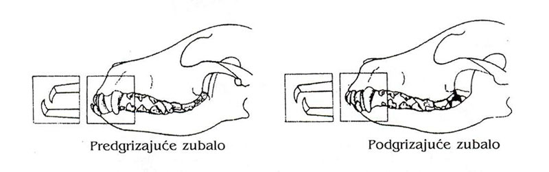Ako se sekutići gornje i donje vilice dodiruju svojim vrnovima, onda takvo zubalo nazivamo "kleštastim zubalom". Zubalo psa nije uvek pravilno. Usled nesklada u vilicama, koje mogu biti različite dužine dolazi i do izmenjenog ugriza. Tako nastaju dva karakteristična ugriza. AKo pri ugrizu sekutići donje vilice stoje znatno ispred sekutića gornje vilice, tada pas ima zubalo za koje kažemo "predgrizač". I obratno, kada pri ugrizu sekutići donje vilice stoje znatno iza sekutića gornje vilice, tada pas ima zubalo za koje kažemo "podgrizać'. "Predgrizač" i "podgrizač" su diskvalifikaciona mana kod NLT-a.