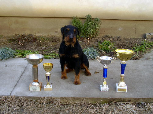 Eksterijer : 2xCAC Prvak rase, šampion u lepoti, visina 37 cm , 42 zuba, Rad : IUO 29.11.2003. ŽABALJ sledoglasnost 4h, voda 4h, jazavac3, lisica4, LZ-7, Svestrana utakmica u Novom Sadu sa 155,5 poena II nagradni razred.