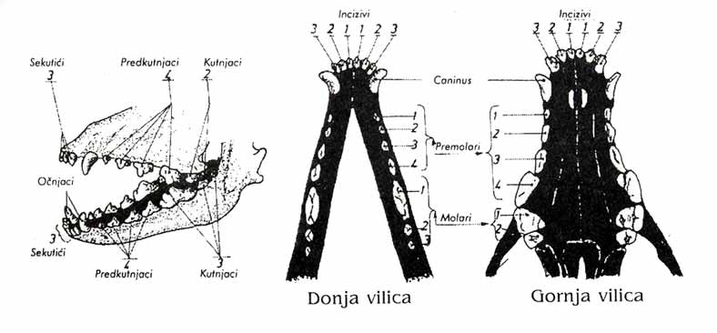 Čeljusti/zubalo/zubi: Veliki zubi. Snažna čeljust sa perfektnim i potpunim makazastim zagrižajem, pri čemu sekutići gornje vilice naležu svojom unutrašnjom površinom na spoljnu površinu sekutića donje vilice. Zubi su pravilno uređani u vilicu. Sa 42 zuba se obrazuje zubna formula.