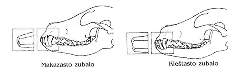 Ako se sekutići gornje i donje vilice dodiruju svojim vrnovima, onda takvo zubalo nazivamo "kleštastim zubalom". Zubalo psa nije uvek pravilno. Usled nesklada u vilicama, koje mogu biti različite dužine dolazi i do izmenjenog ugriza. Tako nastaju dva karakteristična ugriza. AKo pri ugrizu sekutići donje vilice stoje znatno ispred sekutića gornje vilice, tada pas ima zubalo za koje kažemo "predgrizač". I obratno, kada pri ugrizu sekutići donje vilice stoje znatno iza sekutića gornje vilice, tada pas ima zubalo za koje kažemo "podgrizać'. "Predgrizač" i "podgrizač" su diskvalifikaciona mana kod NLT-a.
